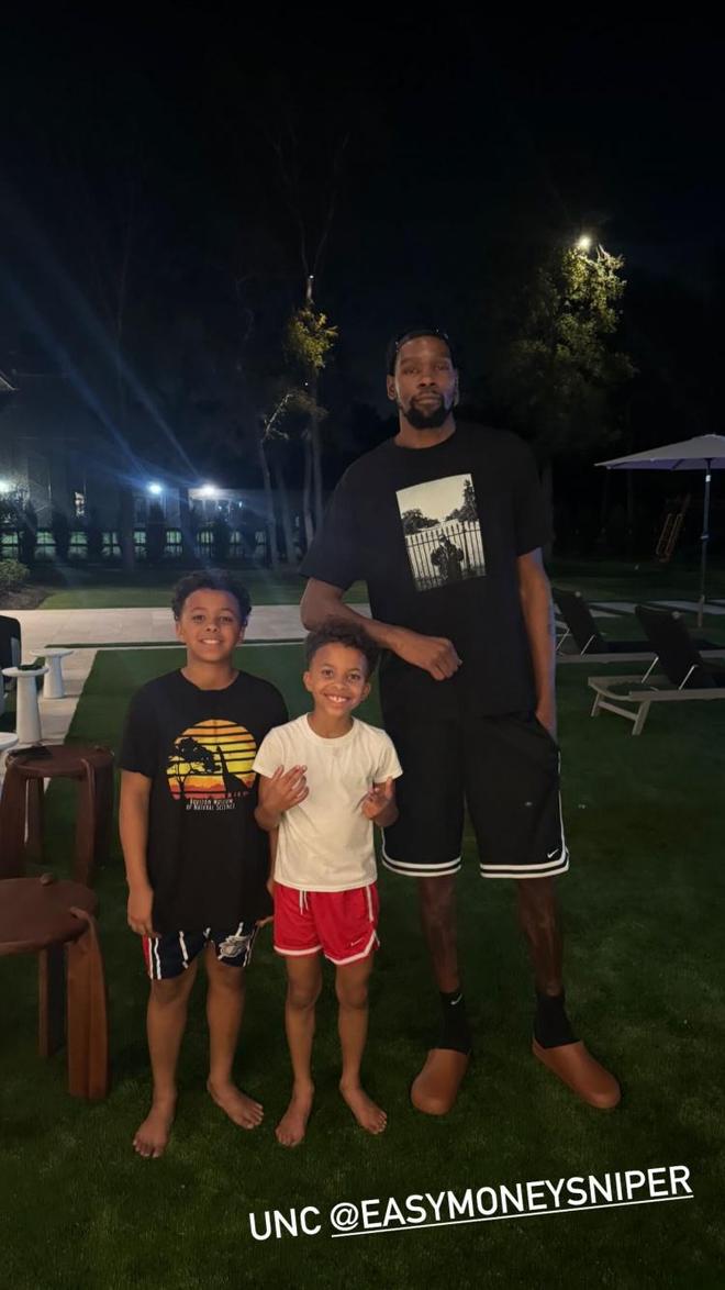 照片中杜兰特和奥古斯汀的两个儿子合影留念。KD和奥古斯汀是得州大学的前队友,而后者在休斯敦有房产,这张照片就可能是拍于奥古斯汀休斯敦的家中。
