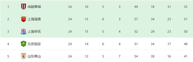 目前,前面24轮中超战罢,成都蓉城的战绩非常高光,16胜5平3负积53分,一举反超上海申花、上海海港两大豪门抢占了中超榜首之位,比第二名上海海港多出2个积分,比第三名上海申花多出3分,在中超还剩最后6轮的情况下,成都蓉城问鼎本赛季中超冠军的希望已经越来越大。
