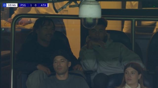 比赛转播镜头给到了看台上观战的杜埃,他在国际比赛日中受伤,缺席了本场巴黎的大名单。