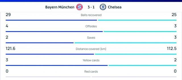 本场比赛拜仁全队跑动距离121.6km,切尔西112.5km,蓝军少跑了9.1km。