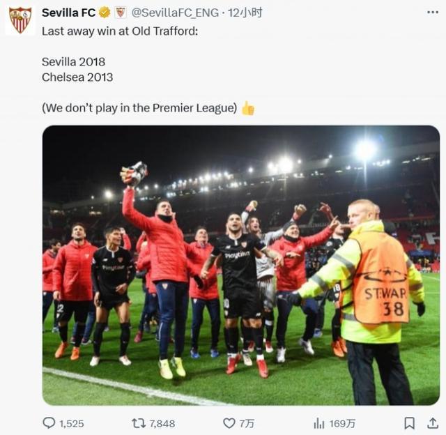 直播吧09月21日宣 切尔西客场1-2不敌曼联,赛后,塞维利亚官推在社媒上发文调侃切尔西。