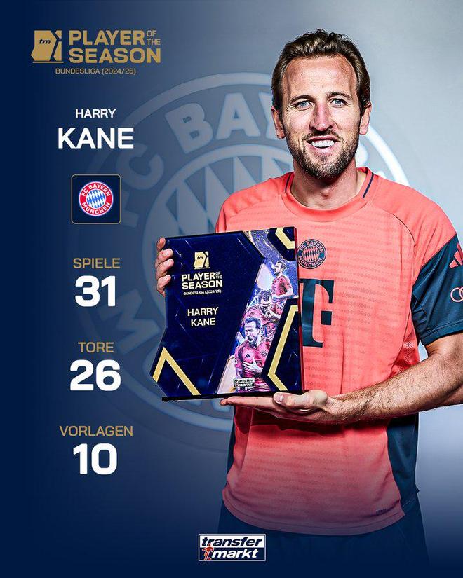 雷速体育9月29日宣 德国《转会市场》网站宣布拜仁球星哈里·凯恩获评24/25赛季德转德甲最佳球员。