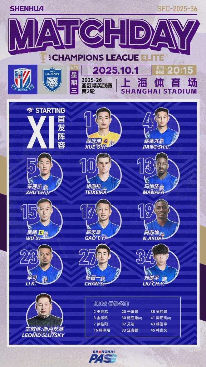 上海申花首发:1-薛庆浩、4-蒋圣龙、5-朱辰杰、10-特谢拉、13-马纳法、15-吴曦、17-高天意、19-阿苏埃、23-李可、27-陈晋一、34-刘诚宇