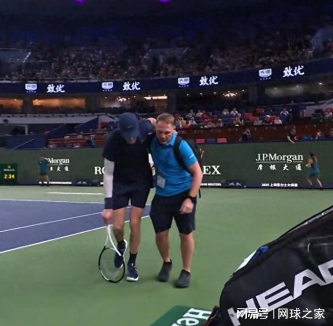 辛纳在决胜盘2比3落后时,因抽筋严重实在无法坚持,不得不选择了退赛,最后是被人架着走出赛场的。