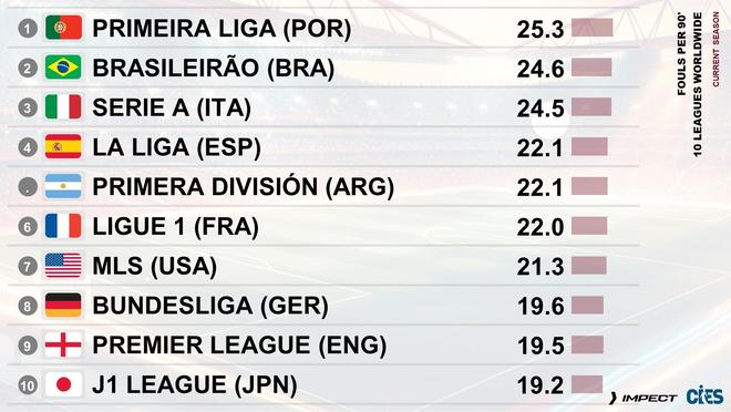 当地时间10月13日,瑞士足球天文台统计了各国联赛每90分钟的犯规情况,其中葡超以25.3次犯规位居榜首,巴甲以24.6次位列第二,意甲以24.5次位列第三。