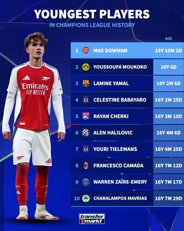 至此,枪手成为1969-70赛季的利兹联后,史上第2支在单季欧冠前4场比赛全胜且不失一球的英格兰球队。此外,枪手还贡献了一个历史之最:小将道曼此役替补登场,超越穆科科和亚马尔等人,以15岁308天的年龄,成为冠军联赛历史上最年轻的出场球员。